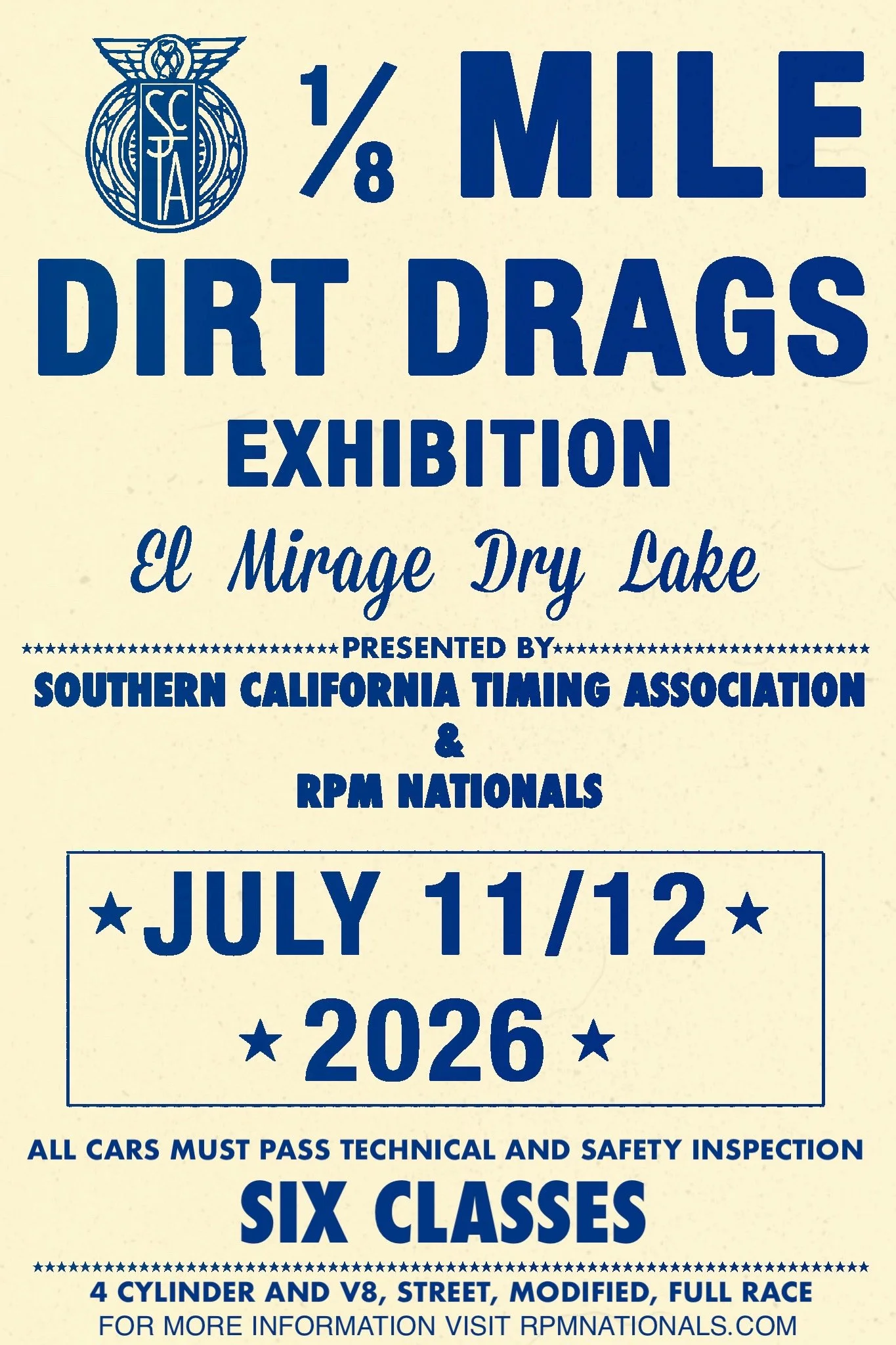 Something new we’re pretty damn excited about, drag racing back on the lake for the first time in 70+ years. I’ve been an SCTA member for a few decades now, running a car off and on when time/money allows, through that was able to form some great friendships and one of those has been with Bill Lattin, multi time SCTA President, multi record holder and general historian/collector of all things vintage hot rod and racing. Between Bill and the rpm crew we’ve been bouncing the idea of some vintage races involving the SCTA around for awhile, well Bill knows the ins and outs better than anyone and a formal proposal was written up and made it through all proper channels and now we’re happy to say RPM will be teaming up with SCTA to bring some side by side racing back to the lakebed.